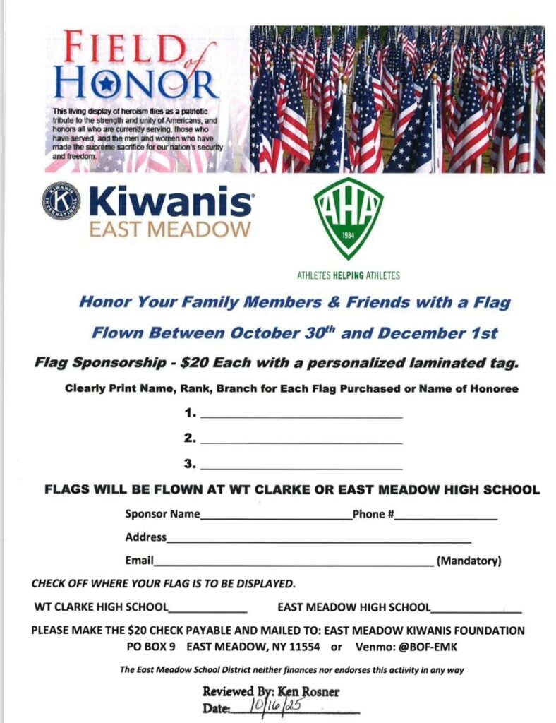 The annual Field of Honor flag display will be installed on October 30th at both Clarke and East Meadow High Schools. The Field of Honor is a way to recognize those who have served and are currently serving in our armed services. Athletes Helping Athletes student leadership groups from Clarke and EMHS, along with the East Meadow Kiwanis Club asks that you consider sponsoring a flag.
