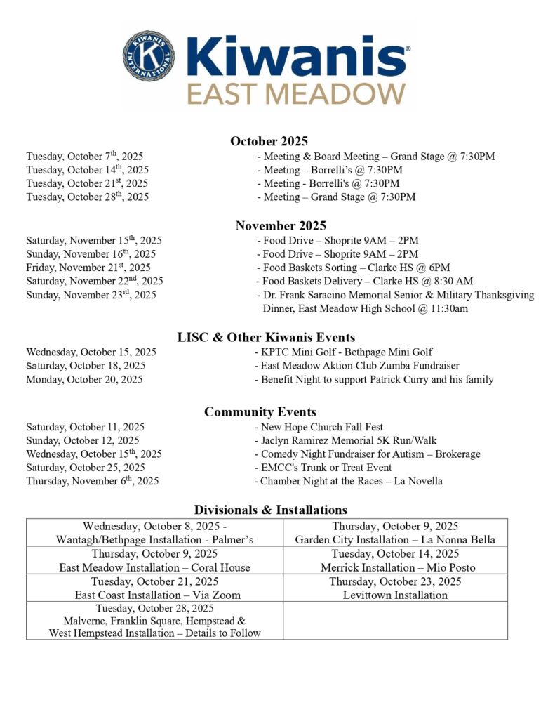 Dear Kiwanis Family, I would like to thank Immediate Past President Melody for the amazing year we had and for all of her dedication to our club. I’m honored, excited and humbled to begin my term as president of our amazing Kiwanis Club. Thank you for your trust and support — I’m truly grateful to be part of a group so deeply committed to service, kindness, and community. Our club is extraordinary because of you — our members. Your dedication, generosity, and spirit of volunteerism are the heartbeat of everything we do. Whether it’s organizing events, lending a helping hand, or simply showing up with a smile, you make our club a place where real impact happens. As we look ahead, I’m looking forward to the meaningful work we’ll be doing together. Here are just a few of the exciting events coming up: 📅 October 9th – Installation of the New Board Join us at the Coral House, 70 Milburn Ave, Baldwin, NY 11510, as we celebrate the installation of our new board. If you haven’t RSVP’d yet, please do so as soon as possible by emailing Tom Gallagher at [email protected]. 🎃 Trunk or Treat – A fun and safe Halloween celebration for local families. 🦃 Thanksgiving Food Sorting & Delivery – Helping ensure families in need have a warm and nourishing holiday. 🍽️ Senior & Military Thanksgiving Dinner – Honoring and serving those who’ve given so much to our community. 🎁 Toy Drive – Bringing joy to children during the holiday season. 🛒 Holiday Food Pick-Up – Supporting families with essential groceries during the winter months.