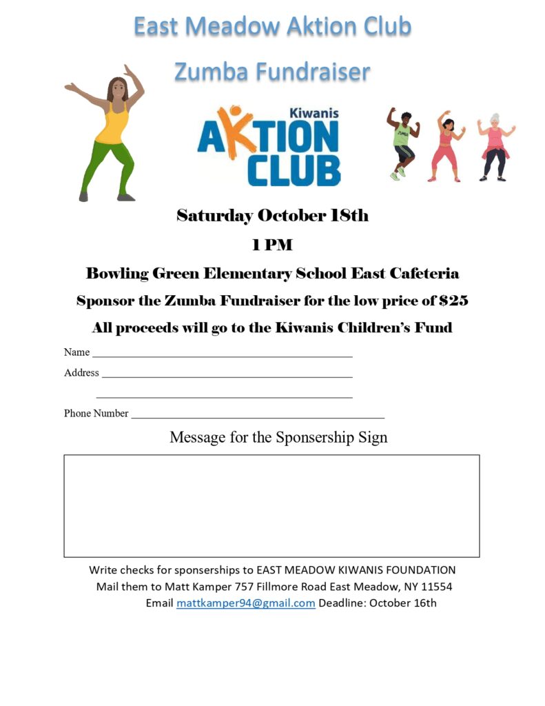 The East Meadow Aktion Zumba Fundraiser that was scheduled to occur in the WT Clarke High School Cafeteria on Saturday, October 18th, 2025 from 1 PM-4 PM will now be taking place in the Bowling Green Elementary School East Cafeteria. If you cannot attend or would like to contribute further, there are Sponsorship Options available. If you have any questions, please let me know.