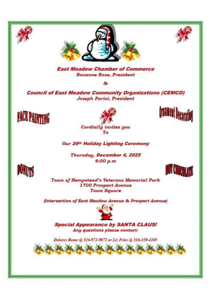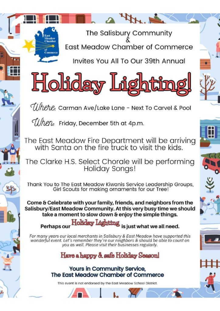 The East Meadow Chamber of Commerce will be hosting in conjunction with CEMO the Annual Holiday Christmas Lighting Ceremony. It will take place on Thursday, December 4th at 6 PM at Veterans Memorial Park. The following day on Friday, December 5th at 4PM the Chamber will also be hosting the Salisbury Holiday Tree Ceremony next to Carvel on Carman Avenue.