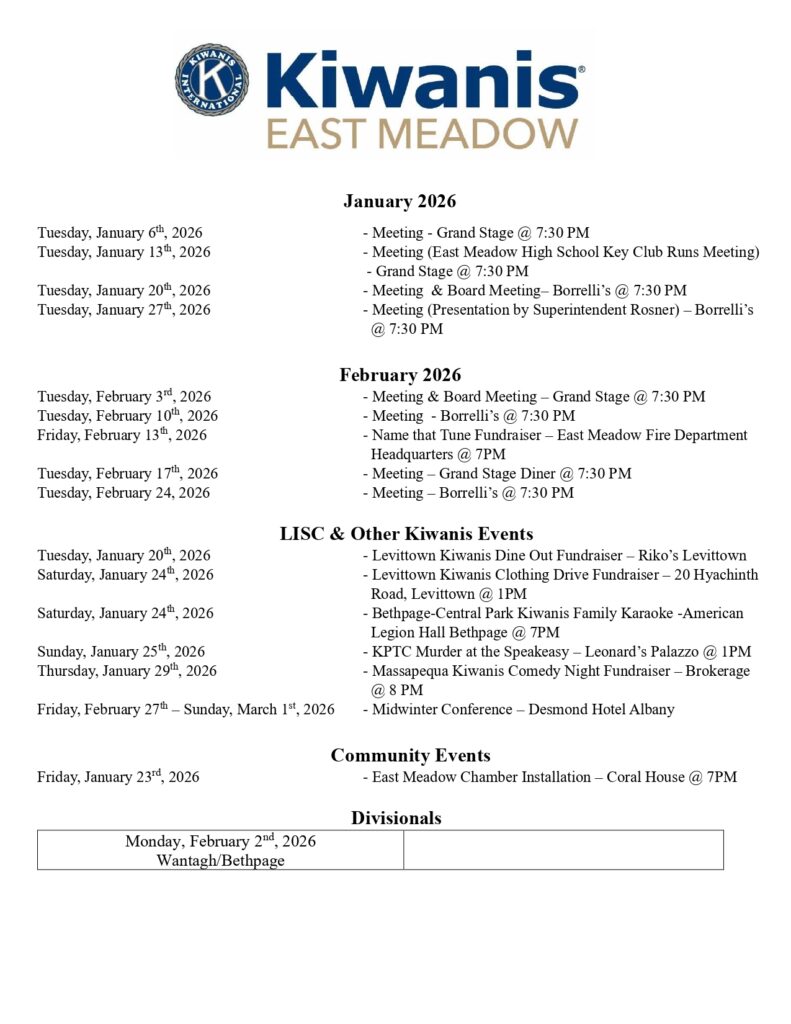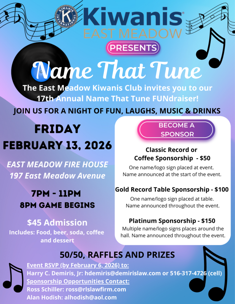 East Meadow Kiwanis invites you to the 16th Annual Name that Tune Fundraiser on Friday, February 13, 2026, from 7–11 PM at East Meadow Fire Department Headquarters (197 East Meadow Ave). The game starts at 8 PM. Tickets are $45 per person, including food, drinks, and dessert. RSVP to DPP Harry Demiris by February 6, 2026. For sponsorships, contact SDPLTG Ross Schiller or Alan Hodish.