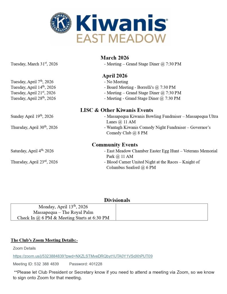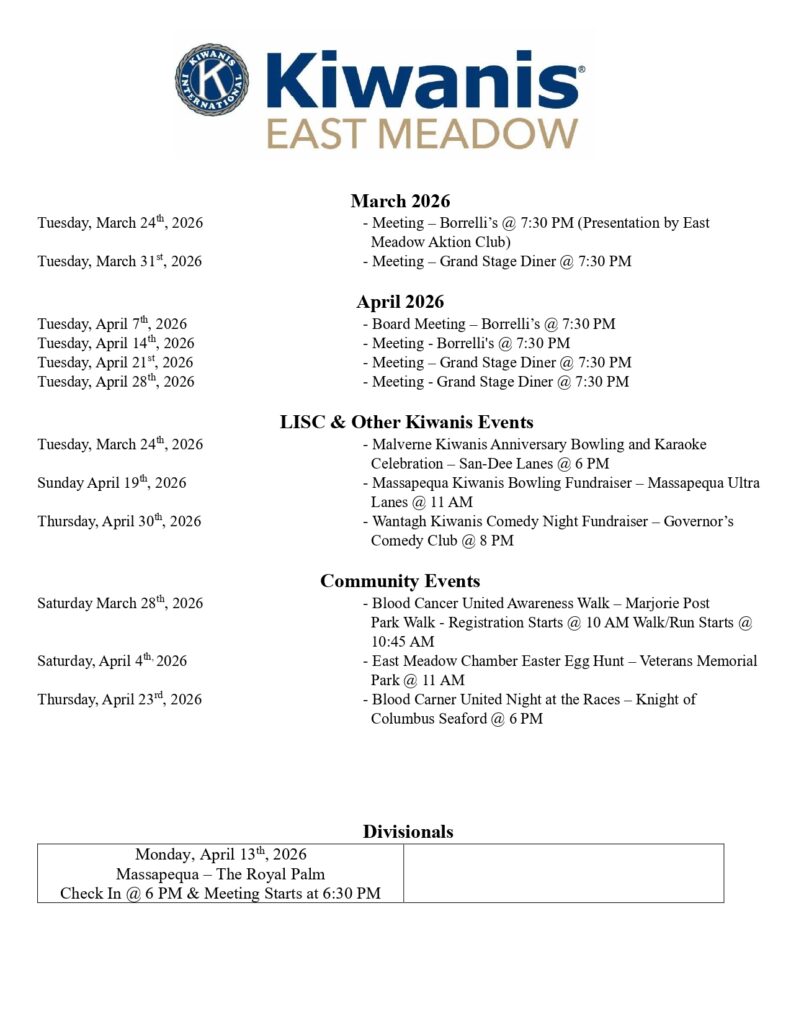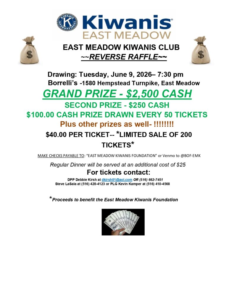East Meadow Kiwanis will be holding its Reverse Raffle Fundraiser on June 9, 2026 at Borrelli’s. Tickets are now on sale! Purchase a chance to win the Grand Prize of $2500 CASH!